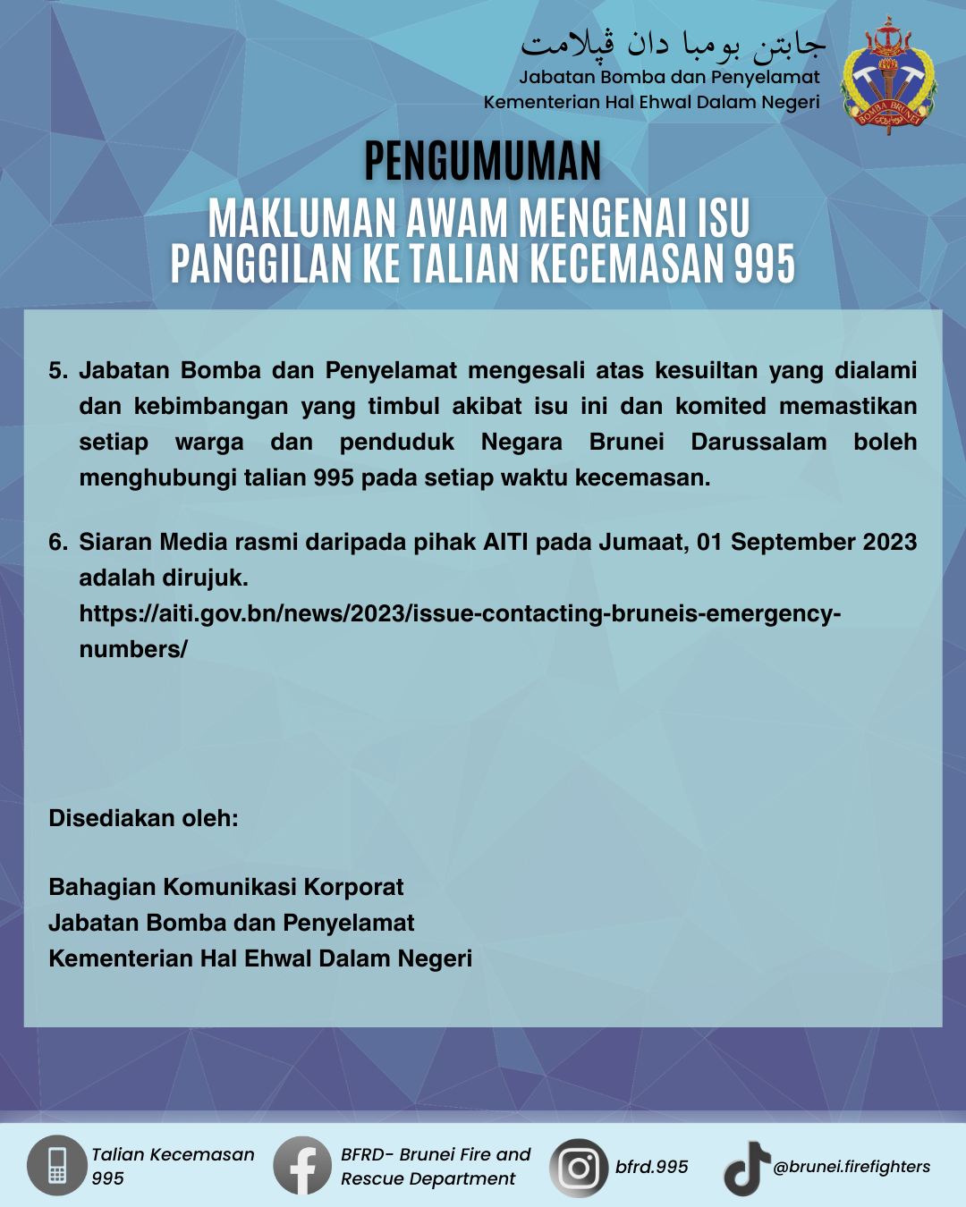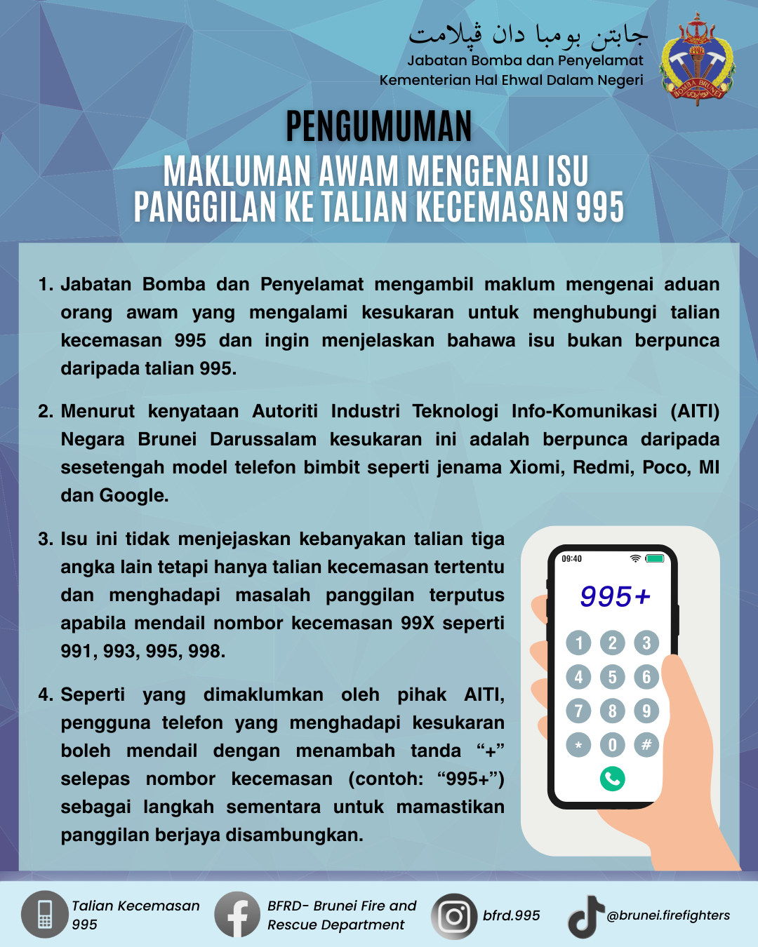 Bandar Seri Begawan, 10 Januari 2026 – Jabatan Bomba dan Penyelamat telah menerima peningkatan panggilan kecemasan susulan hujan lebat berterusan...